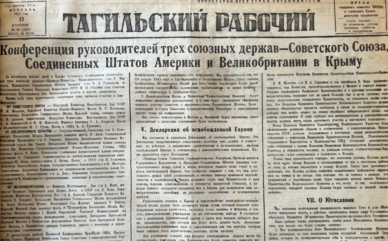 За 1418 дней, которые длилась Великая Отечественная война, вышло 1066 номеров газеты «Тагильский рабочий». На долгое время она стала едва ли не единственным источником информации для тысяч жителей Нижнего Тагила, мощным оружием мобилизации и пропаганды. Нам стало любопытно узнать, как жил тыловой город в 1941-1945 годах, и попытаться рассмотреть за газетными строками жизнь обычного человека. Об этом исторический спецпроект ИА «Все новости» – «1418 дней города красного неба». Все публикации читайте здесь. Этот выпуск – о феврале 1945 года: тагильчане ведут наступательные бои, бронепоезд «Сталинский Урал» прокладывает путь к победе, а местные жители жалуются на бракованные вещи, которые непригодны к использованию. Материал для вас подготовила Полина Марченко.