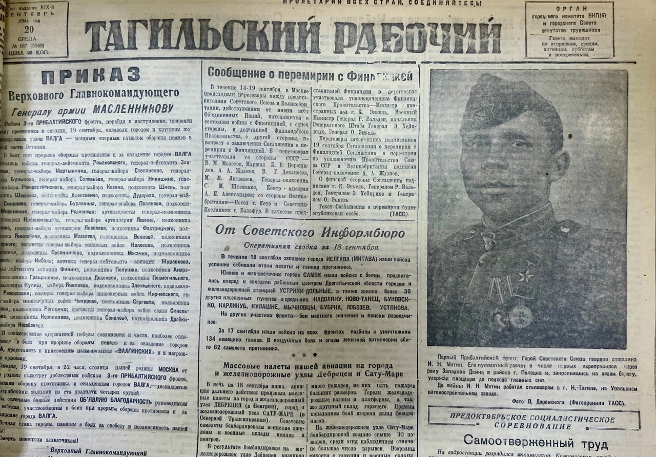 За 1418 дней, которые длилась Великая Отечественная война, вышло 1066 номеров газеты «Тагильский рабочий». На долгое время она стала едва ли не единственным источником информации для тысяч жителей Нижнего Тагила, мощным оружием мобилизации и пропаганды. Нам стало любопытно узнать, как жил тыловой город в 1941-1945 годах, и попытаться рассмотреть за газетными строками жизнь обычного человека. Об этом исторический спецпроект ИА «Все новости» – «1418 дней города красного неба». Все публикации читайте здесь . Этот выпуск – о сентябре 1944 года: в Тагиле открывают индустриальный институт, судят женщину, которая занималась незаконными абортами, в город приезжает известный актер Александр Хвыля. Материал для вас подготовила Полина Марченко.